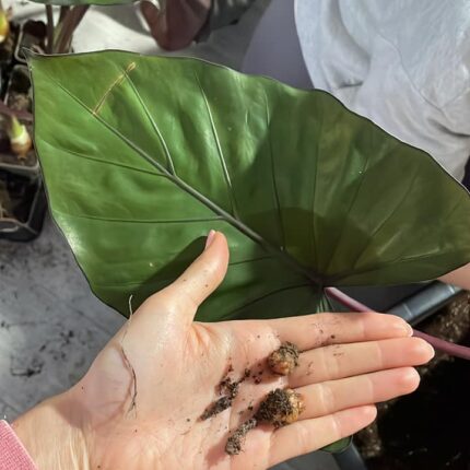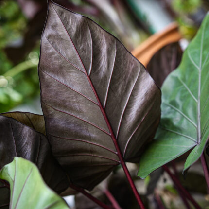Alokazja Metalhead to wyjątkowa hybryda o dużych, połyskujących lisciach. To właśnie od jej opalizujących w słońcu liści wzięła się jej nazwa. Wychodzące ciemnofioletowe młode liście wkraczając w dorosłość stają się coraz bardziej zielone.