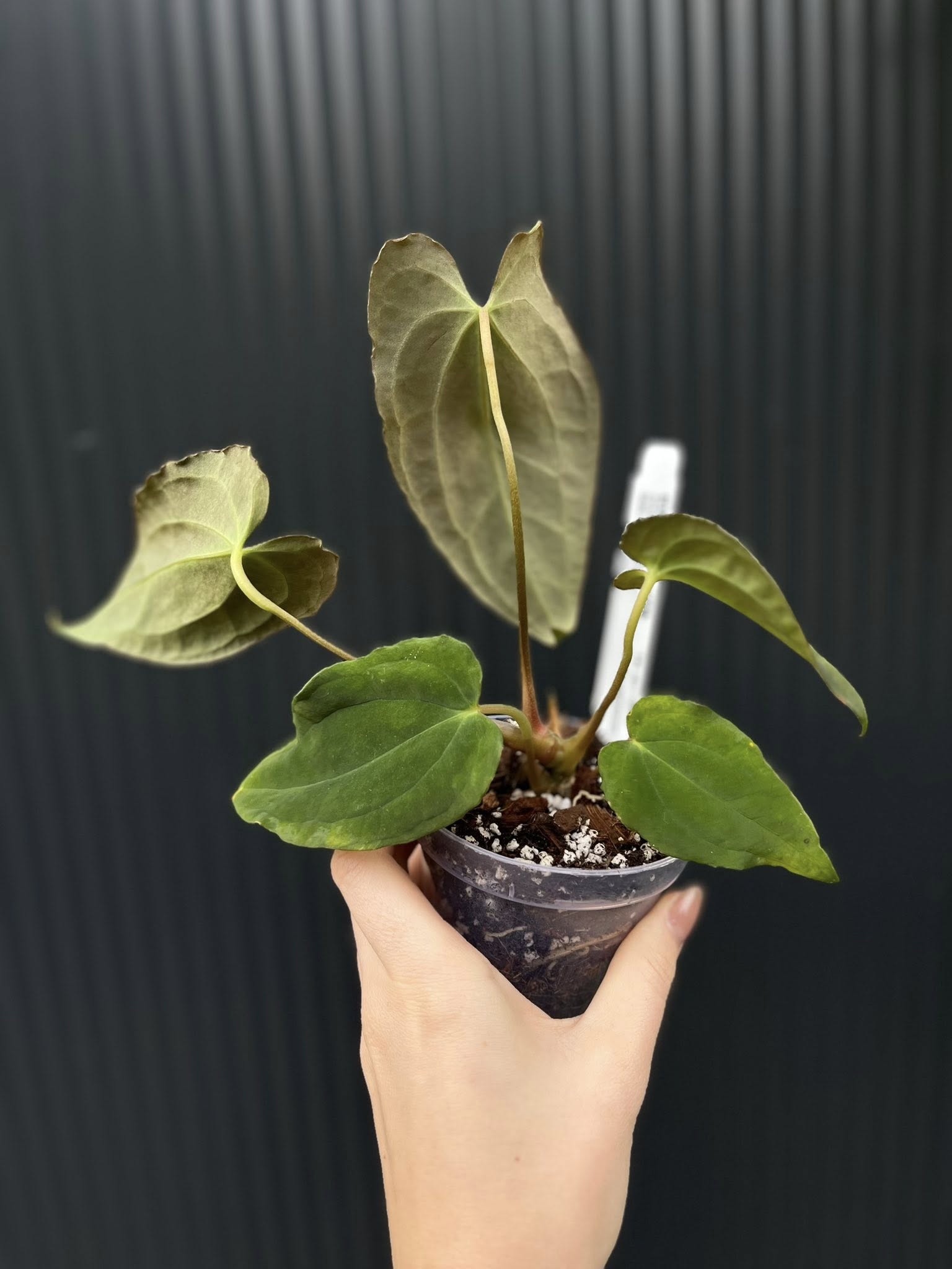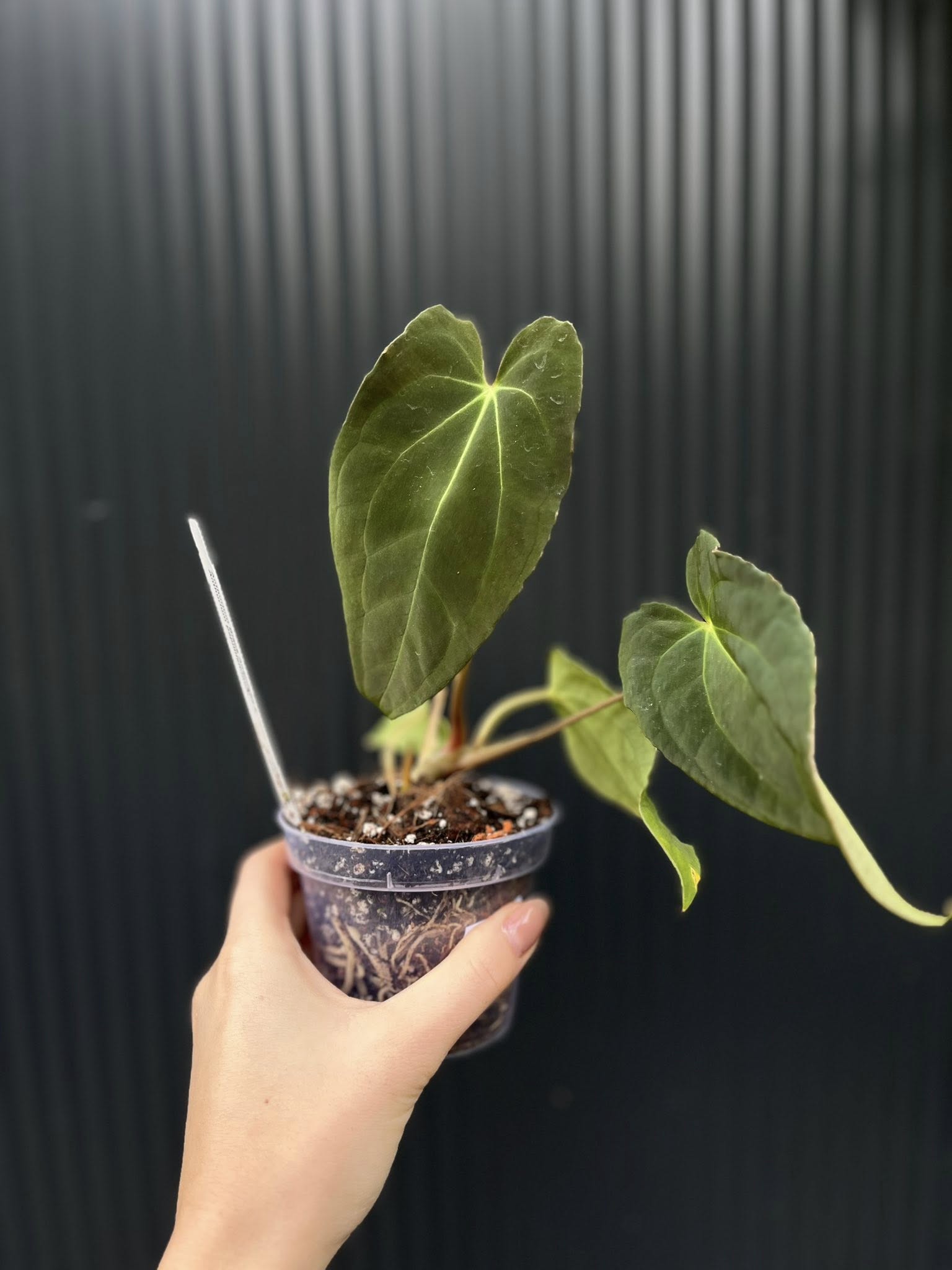 Anthurium Black Anaconda x Papillilaminum to unikatowa hybryda stworzona z połączenia dwóch niezwykle cenionych gatunków. Odmiana ta łączy ciemne, niemal czarne liście charakterystyczne dla Black Anaconda z miękką, aksamitną fakturą i sercowatym kształtem liści odziedziczonym po Papillilaminum. Efektem jest roślina o wyjątkowo eleganckim, tropikalnym charakterze, która stanowi ozdobę każdej kolekcji roślin egzotycznych.