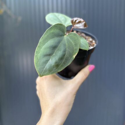 • Liście: Duże, sercowate liście o głębokim zielonym kolorze, pokryte delikatnymi, wyraźnymi żyłkami. Liście mają satynowy połysk, który dodaje roślinie elegancji.