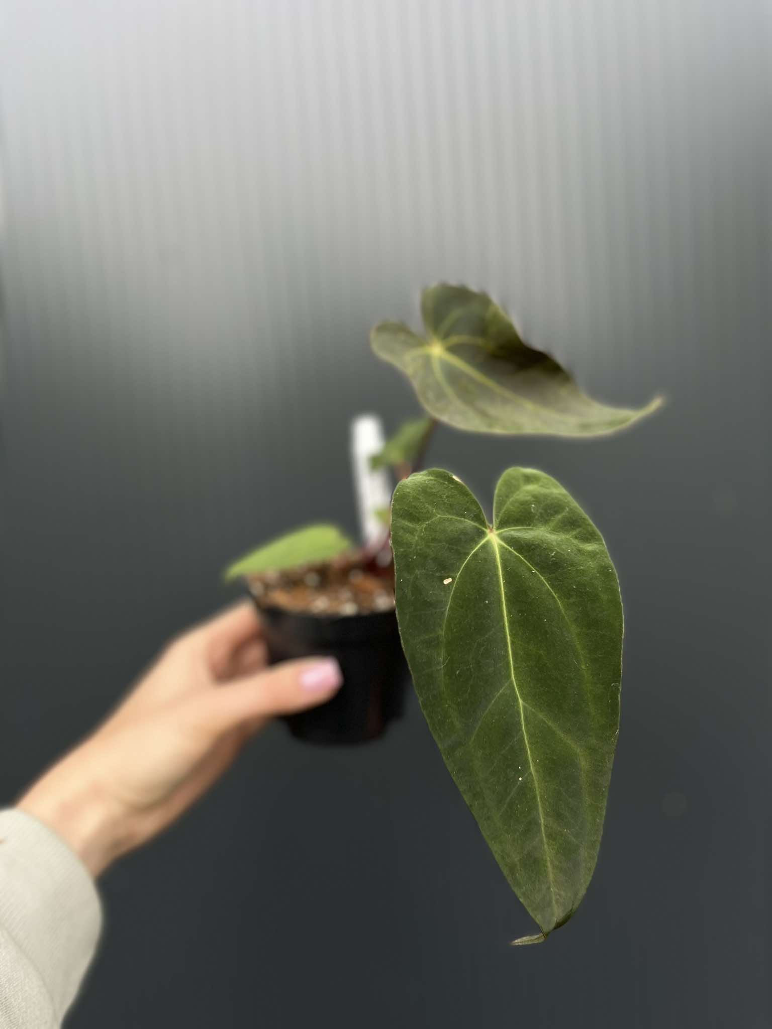 Anthurium Shuar Soul × Papillilaminum to ekskluzywna hybryda o aksamitnych, ciemnych liściach i wyrazistym unerwieniu. Luksusowa propozycja dla koneserów aroidów.